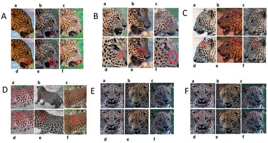 Changes to spot patterns with an injury being documented. Changes in spot markings and rosette patterns of a leopard in reference photos (a–c) and the same set of photos (zoomed in for some photos) marked with red (d–f) on the skin coat to demarcate the point of concern, injury, or change in the relevant photo. (A) Change in the spot markings YM 07—Subsequent to Documented Injury 1 of YM 07: (a–c) reference photos (d) documented original spot formation in December 2017, before injury; (e) documented change in spot formations in June 2018, pc—Saman Abeygunewardena; (f) documented spot formation changes in February 2021, pc—Pasan Seneviratne. (B) Changes in the spot markings of YM 16—Subsequent to the Documented Injury 1 of YM 16: (a–c) reference photos (d) documented original spot formation in July 2020; (e) documented spot formation changes in October 2020, pc—Gautham Kumar; (f) documented spot formation changes in August 2021. (C) Changes in the spot markings of YM 16—Subsequent to the Documented Injury 2 of YM 16: (a–c): reference photos; (d) documented original spot formation in July 2018—before injury; (e) documented changes in spot formations in February 2020, pc—Samith Perera; (f) documented changes in spot formations in September 2021. (D) Change in the spot markings of YM 27—Subsequent to the Documented Injury 1 of YM 27: (a–c) reference photos (d) documented original rosette formation in January 2020—before injury; (e) documented changes in spot formations in October 2020, pc—Janaka Dassanayake; (f) documented changes in rosette formations in March 2021. (E) Changes in the spot markings of YM 59—Subsequent to the Documented Injury 1 of YM 59: (a–c) reference photos (d) documented original spot formation in October 2020—before injury; (e) documented changes in spot formations in January 2021, pc—Chamli Weerasinghe; (f) documented change in spot formations in March 2021. (F) Changes in the spot markings of YM 59—Subsequent to the Documented Injury 2 of YM 59: (a–c) reference photos (d) documented original spot formation in October 2020—before injury; (e) documented changes in spot formations in January 2021, pc—Chamli Weerasinghe; (f) documented changes in spot formations in March 2021 (pc-photo credits).