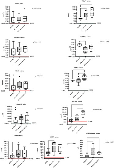 The ferric reducing ability of saliva/serum (FRAS/FRAP), cupric reducing antioxidant capacity (CUPRAC), Trolox equivalent antioxidant capacity (TEAC), uric acid, and advanced oxidation protein products (AOPP) and ratio AOPP/albumin results in healthy horses (n = 14, dark grey), and horses which survived to the CIE (n = 14, silver grey) vs. those that did not (non-survivors, n = 8, white). The plot shows the median (line within box), mean (the cross inside the box), 25th–75th percentiles (box), 5th and 95th percentiles (whiskers), and outliers (•). The dotted and continuous lines show the lower limit of detection (LLOD) and the lower limit of quantification (LLOQ).