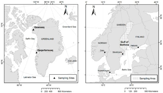 Examined Area. The collection of the samples originates from the Gulf of Bothnia in the Baltic Sea and in West Greenland. The samples were predominantly collected in the locations marked with a circle in the Gulf of Bothnia and with a triangle at the west coast of Greenland.