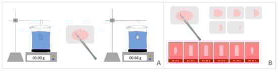 Setup for the volume determination of each ovary (A). After complete immersion of the ovary in water, the displaced volume of water corresponds to the volume of the ovary and can be measured as the weight change. The histological preparation for each ovary is shown in (B). Cross sections of the ovary were made.