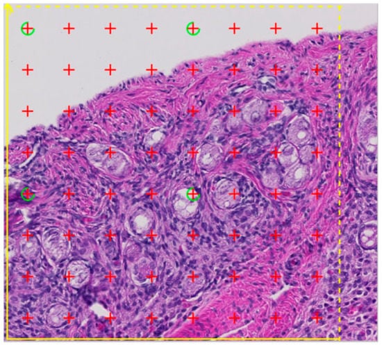 A part of the stained ovary slice with the test grid of 64 points. Points hitting the primordial follicles as well as the four green-colored points hitting the reference space (ovary) were counted and afterwards multiplied with 16 (coarse grid).