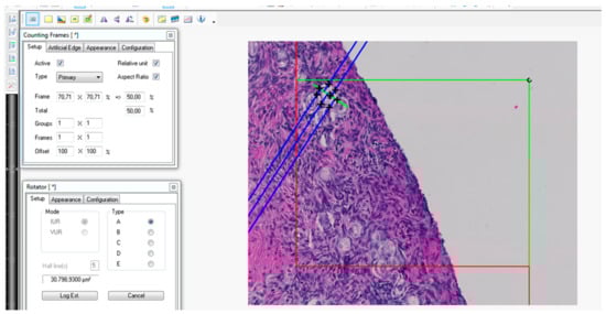 In the next step, the number-weighted mean volume of the follicles () was estimated using the rotator [12,31,32] (Table S1). Here, a single section dissector was used to sample follicles for volume measurements instead of a physical or optical dissector [33]. During testing of the different methods, it became clear that the status of the tissue preservation made a formally more correct approach hardly possible in this rare material. The planar rotator was used every time a centrally sectioned primordial follicle crossed the green lines or was completely within the counting frame and did not touch the red exclusion lines or their extensions.