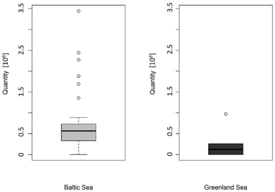 The total estimated number of primordial follicles was analyzed in 46 ovaries from juvenile ringed seals from the Baltic Sea, (divided into 13 Swedish individuals and 33 Finish individuals) and six ovaries from Greenland individuals. Figure 5 shows the median primordial follicle number in the Baltic and in the Greenland individuals (median: Baltic Sea = 565,657; IQR: 399,602; Greenland Sea = 122,475; IQR: 202,096; no statistical test was performed due to low sample size). Unfortunately, it is not possible to make a comparison between the two subpopulations, because the data basis of the Greenlandic individuals is not sufficient.