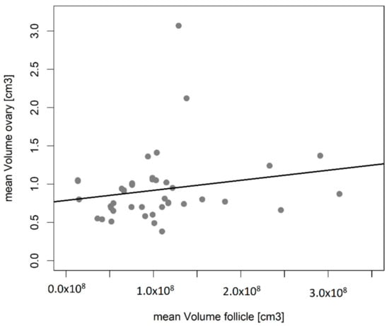 A positive correlation between the number-weighted mean volume of follicles and volume of ovaries were found (LM, p = 0.04) (Figure 6).