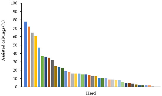 Distribution of assisted calving prevalence in the 40 Italian Holstein cow herds enrolled in the study. Each column corresponds to a single herd.