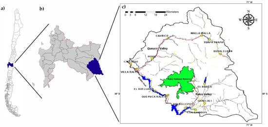 There are three main rivers cross the commune: The Queuco river begins at the east of the commune, north of the Copahue volcano, drawing an inverted U to the west near the northern limits of the commune, until it flows into the Biobío River. The Ralco River begins between the Callaqui and the Copahue volcanoes and moves straight to the south-west, where it flows into the Biobío River. The Biobío River marks the southwesternmost limit of the commune between the discharges of the Queuco and Ralco rivers (Figure 1). People are distributed in two major sections of the commune: the Queuco valley (which includes the Queuco river and its tributaries) and the Biobío valley (which includes the Biobío River, the Ralco river and its tributaries). Several communities are distributed along these two valleys. Butalelbún, Trapa-Trapa, Malla-Malla, Cauñicu and Pitril are the communities located in the Queuco valley that participated in the program. Further, Guallalí, El Barco, Ralco-Lepoy, El Avellano, Los Guindos and Quepuca-Ralco are located in the Biobío valley. Callaqui is located where the Queuco River discharges into the Biobío River. Given their short distance and similarities, Trapa-Trapa and Butalelbún were grouped into a single cluster for this study and are henceforth referred to as the Trapa-Trapa cluster.