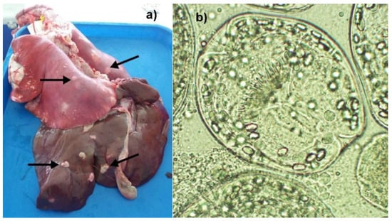 (a) Hydatid cysts in the lung and liver of sheep (arrow). (b) Protoscolex of Echinococcus granulosus s.l. extracted from a large hydatid cyst. Alto Biobío, 2020.