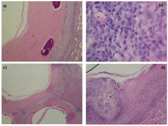 Small hydatid cyst extracted from sheep liver and lungs (hematoxylin-eosin (H&E) stain). (a) The three characteristic layers of the cyst and amorphous deposits stained dark violet with H&E, concordant with calcium deposits. (b) Granulomatous inflammation with the presence of multinucleated giant cells and some eosinophilic polymorphonuclear leukocytes. (c) Miliary pattern of multiple coalescing cysts with a peripheral granulomatous inflammatory response. (d) Granulomas with detritus in the center and a peripheral adventitial layer. Alto Biobío, 2020.