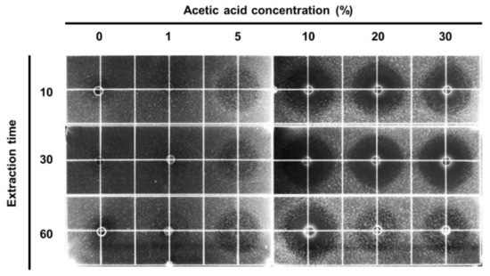 Determination of acetic acid concentration and incubation time to prepare defatted HIL extracts from crude-oil-extracted crushed HIL powder. HIL were grown for 11 days and then crude-oil-extracted HIL were prepared through the extraction of crude oil from HIL by an expeller extractor. Each batch of crude-oil-extracted, crushed HIL powder was incubated in various concentrations of acetic acid solution (0–30%) for 10, 30, or 60 min to isolate the extract. Each extract was dissolved in 0.05% acetic acid solution, and 10 µL of the extract was loaded into the wells in the underlay gel and incubated for 24 h to determine antimicrobial activity using RDA.