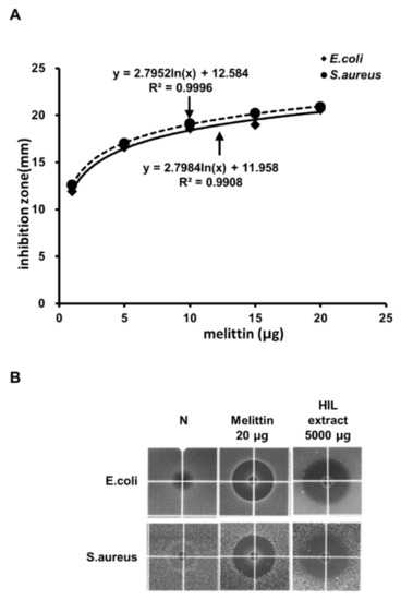 Determination of the amount of defatted HIL extract that corresponds to the antimicrobial activity of melittin. (A) Standard curve of the inhibitory zone with various amounts of melittin against E. coli and S. aureus. The inhibitory zone was measured as the diameter of the clear circular zone. Standard curve was presented by natural logarithmic trendline calculated by Excel in Microsoft Office 16. (B) Comparison of the antimicrobial activities of melittin and defatted HIL extract. Each sample was dissolved in 0.05% acetic acid solution, and 10 µL of the extract was loaded into the wells in the underlay gel and incubated for 24 h to determine antimicrobial activity using RDA. N: 0.05% acetic acid alone.