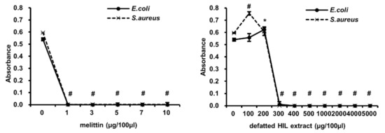 Determination of MIC of melittin and defatted HIL extract against E. coli and S. aureus. Briefly, 1 × 106 cfu/mL of 90-µL E. coli or S. aureus suspension was treated with various concentrations of 10-µL melittin or defatted HIL extract dissolved in 0.05% acetic acid solution. Then, bacteria were grown for 24 h at 37 °C. The experiments were independently performed in triplicate. A concentration of 0 µg/100 µL of melittin and defatted HIL extract indicated 0.05% acetic acid alone. The statistical analysis was performed by Student t-test. The significant differences were determined by comparing the absorbance of each experimental group with the control (0 µg/100 µL). Each value represents the means ± standard deviations of absorbance. * and # indicate p < 0.05 and p < 0.0001, respectively.