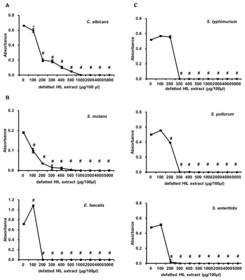 Antimicrobial activity of defatted HIL extracts against C. albicans (A), S. mutans, E. faecalis, (B) and Salmonella species (C). Briefly, 1 × 106 cfu/mL of 90-µL S. typhimurium, S. pullorum, and S. enteritidis, suspensions were treated with various concentrations of 10-µL melittin or defatted HIL extract dissolved in 0.05% acetic acid solution. Then, bacteria were grown for 24 h at 37 °C. The experiments were independently performed in triplicate. A concentration of 0 µg/100 µL of melittin and defatted HIL extract indicates 0.05% acetic acid alone. The statistical analysis was performed by Student t-test. The significant differences were determined by comparing the absorbance of each experimental group with the control (0 µg/100 µL). Each value represents the means ± standard deviations of absorbance. * and # indicate p < 0.05 and p < 0.0001, respectively.