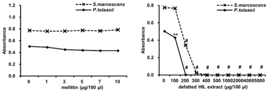Antimicrobial activity of melittin and defatted HIL extracts against AMP-resistant S. marcescens and P. tolaasii. Briefly, 1 × 106 cfu/mL of 90-µL S. marcescens or P. tolaasii suspensions were treated with various concentrations of 10-µL melittin or defatted HIL extract dissolved in 0.05% acetic acid solution. Then, bacteria were grown for 24 h at 37 °C. The experiments were independently performed in triplicate. A concentration of 0 µg/100 µL of melittin and defatted HIL extract indicates 0.05% acetic acid alone. The statistical analysis was performed by Student t-test. The significant differences were determined by comparing the absorbance of each experimental group with the control (0 µg/100 µL). Each value represents the means ± standard deviations of absorbance. ** and # indicate p < 0.05 and p < 0.0001, respectively.