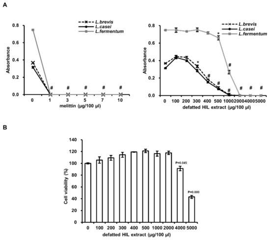 Antimicrobial activity of melittin and defatted HIL extracts against Lactobacillus species and cytotoxicity of defatted HIL extracts to Caco-2 human intestinal cells. (A) Determination of MIC of melittin and defatted HIL extract against three kinds of Lactobacillus species. Briefly, 1 × 106 cfu/mL of 90-µL E. coli or S. aureus mixture was treated with various concentrations of 10-µL melittin or defatted HIL extract dissolved in 0.05% acetic acid solution. Then, bacteria were grown for 24 h at 37 °C. The experiments were independently performed in triplicate. A concentration of 0 µg/100 µL of melittin and defatted HIL extract indicates 0.05% acetic acid alone. The statistical analysis was performed by Student t-test. The significant differences were determined by comparing the absorbance of each experimental group with the control (0 µg/100 µL). Each value represents the means ± standard deviations of absorbance. * and # indicate p < 0.05 and p < 0.0001, respectively. (B) Analysis of the cytotoxic activity of defatted HIL extract. A total of 1 × 104 cells/well were treated with various concentrations of defatted HIL extract dissolved in 0.05% acetic acid solution after 24 h cell attachment and then further cultured in 5% CO2 atmosphere for 24 h at 37 °C. The experiments were independently performed in triplicate. A concentration of 0 µg/100 µL of defatted HIL extract indicates 0.05% acetic acid alone. Bar values represent the means ± standard deviations of relative % cell viability compared to that of control (0 µg/100 µL). The significant differences were determined by comparing the % cell viability of each experimental group with that of control (0 µg/100 µL of defatted HIL extract).