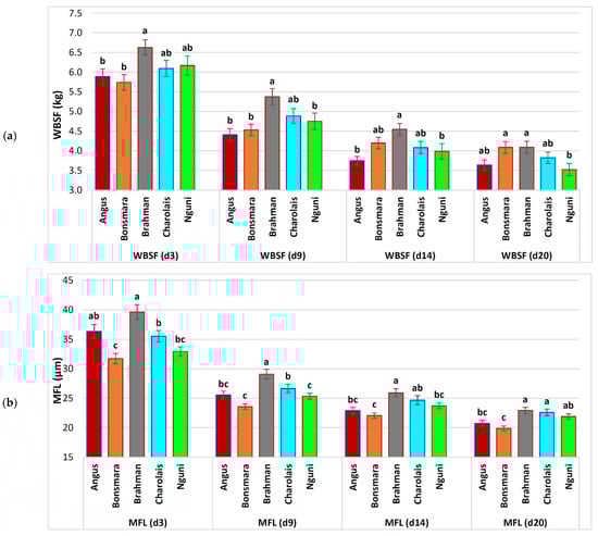 Changes in tenderness in five South African beef breeds over an ageing period of 20 days. Least squares means (LSM) that were statistically significantly different within ageing periods (p ≤ 0.05) are indicated with different ascending letter superscripts (a, b, c). Error bars represent the standard errors of these LSM: (a) WBSF—Warner–Bratzler shear force; (b) MFL—myofibril fragment length.