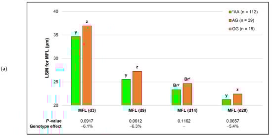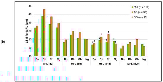 Additive effects of the capn2_780 genotype and ageing on myofibril fragment length (MFL). *AA—the genotype that favored tenderness. Within each ageing period, different descending letter superscripts (z, y) tended to be significantly different (p ≤ 0.10): (a) genotype and ageing effects data pooled for all breeds; Br—different only when breeds were added to the simplified model; (b) genotype and ageing effects on MFL for individual South African beef breeds. Bo—Bonsmara; Bh—Brahman; Ch—Charolais; Ng—Nguni.
