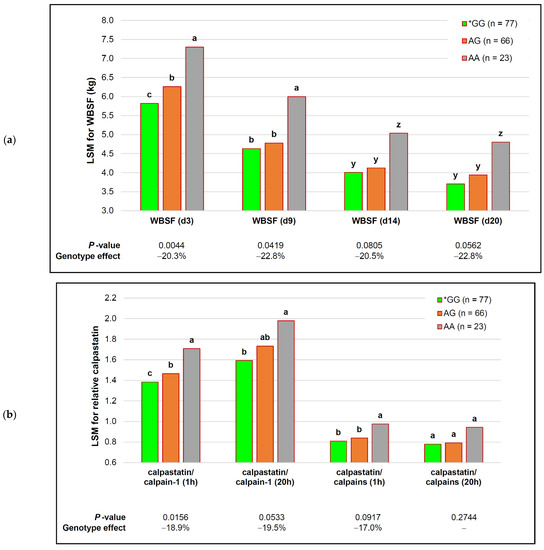 The capn1_184 SNP exhibited a strong, stable association with the WBSF over the entire ageing period (Figure 3a) and during intermediate ageing (d 9–d 14) for the MFL (Table 5), resulting in large phenotypic responses ≥19%). The differences between means observed for the different genotypes sustained levels greater than 1 kg shear force throughout the different ageing periods, where a 20.3% decrease in the WBSF of d 3 was maintained throughout, and up to 22.8% on d 20. The effect on the WBSF on d 20 was likely ascribed to multiple testing (adjusted p ≤ 0.1250) and this effect would need to be confirmed in a larger dataset. These genotype associations were additive to decreases in the WBSF of between 34.2 and 37.1% in all three genotypes over the ageing period (Figure 3a). Similar results were observed for the MFL at d 9 and d 14 of ageing, where myofibril lengths in *GG bulls were 7.31 µm and 8.04 µm shorter than AA bulls, respectively.
