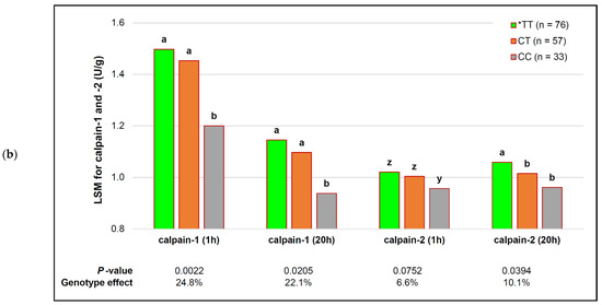 Additive effects of the capn1_187 genotype and ageing on tenderness in representative purebred South African beef bulls. *TT—the genotype that favored tenderness. Within each ageing period, different ascending letter superscripts (a, b) were significantly different p ≤ 0.05), and those that tended to be significantly different p ≤ 0.10) were indicated with different descending letter superscripts (z, y): (a) Warner–Bratzler shear force (WBSF); the effect on d 20 only tended to be significant after FDR adjustment (adjusted p ≤ 0.0558); (b) calpain protease activities.