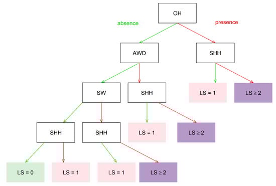 A decision tree to classify cows into different locomotion scores using observed in-parlour scoring indicators (n = 3095). n: the number of observations in the training set. Illustration: The green arrow from the root node pointed to the internal node when the indicator was absent. In contrast, the red arrow pointed to the internal node when the indicator was present. LS = locomotion score, SW = shifting weight, AWD = abnormal weight distribution, SHH = swollen heel or hock joint, OH = overgrown hoof.