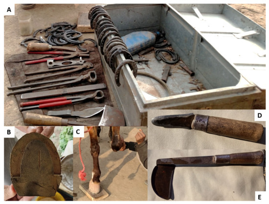 All farriers used shoes and nails within their business. Seven farriers only used iron shoes. The remaining farriers used iron and rubber (n = 3). All farriers purchased some of their equipment, with two farriers producing equine shoes in their own furnaces from iron construction rods, whereas the rest of the farriers purchased shoes from hardware shops. All farriers reported using the traditional hoof knife (Figure 1E), a hoof knife (Figure 1D), a hoof or flat rasp, and an anvil. Nine farriers reported using a rounding hammer, a driving hammer, and hoof nippers. Eight farriers reported using a flat wooden plank to check hoof balance, seven reported using nail nippers, six used a chisel, four used clench cutters and four used a hoof pick (Figure 1). Two farriers made some of their own tools. Many tools were partially worn out, with only the blades in working condition. Several owners and farriers reported injuries caused by worn grips or handles.