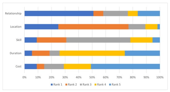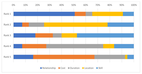 Owners ranking of the reason that they selected a particular farrier to provide services to their donkey. Relationship—the relationship between the owner and the farrier; Location—the location of the farrier; Skill—the skill or knowledge of the farrier; Duration—the time between shoeings; Cost—the charge per hoof.