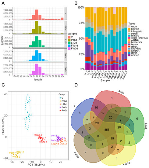 Overview of the small RNA sequencing data: (A) Distribution of total identified small RNAs’ lengths. (B) Classification of all detected small RNAs. (C) Principal component analysis of the total identified miRNAs. (D) Venn diagram illustrating the overlap of miRNAs across five different stages.