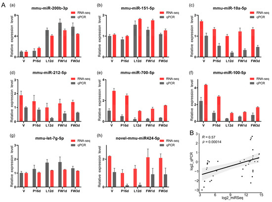 Validation of the expression of miRNAs using qPCR: (A) (a–h). The relative expression levels of eight selected miRNAs measured by qPCR in five stages. The expression levels were normalized against the expression level of the internal control U6 using the comparative cycle threshold (2−ΔΔCt) method. Meanwhile, for each miRNA, the stage of lowest sequencing abundance in the five different stages was used as a reference sample for comparisons. Data are presented as the mean ± standard error of the mean (SEM) for three replicates. (B) Scatterplot between the qPCR and RNA-Seq results of the eight selected miRNAs. The y-axis corresponds to the log2 of the qPCR ratios, while the x-axis shows the log2 of the RNA-Seq ratios, for the eight selected miRNAs.