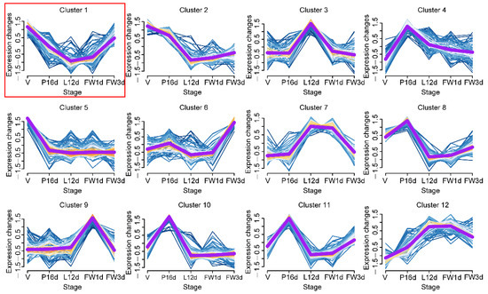 Expression dynamics of 12 miRNA clusters during murine mammary gland development. The purple line represents the miRNAs’ expression trend in each cluster.