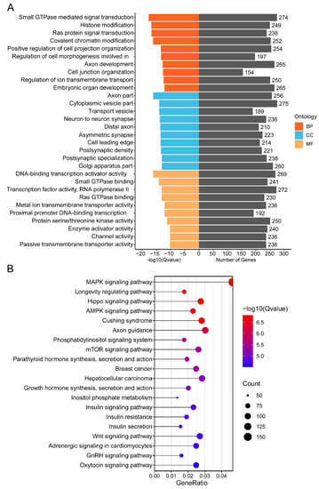 We preformed GO enrichment and KEGG pathway analysis to investigate the functions of cluster 1 miRNAs’ target genes. GO enrichment analysis showed that the target genes were mainly found to be involved in biological processes such as small GTPase-mediated signal transduction (GO:0007264), histone modification (GO:0016570), covalent chromatin modification (GO:0016569), regulation of cell morphogenesis involved in differentiation (GO:0010769), and Ras protein signal transduction (GO:0007265) (Figure 4A; Supplementary Table S5). The KEGG pathway analysis revealed that 324 signaling pathways were enriched (Supplementary Table S6). Among the top 20 signaling pathways, the MAPK signaling pathway (mmu04010), mTOR signaling pathway (mmu04150), parathyroid hormone synthesis, secretion, and action (mmu04928), Hippo signaling pathway (mmu04390), Wnt signaling pathway (mmu04310), and oxytocin signaling pathway (mmu04921) were significantly related to murine mammary gland development (Figure 4B).