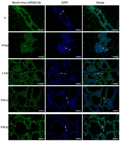 3.6. Novel-mmu-miR424-5p Expression in Distinct Development Stages Assessed by FISH