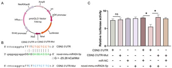 Novel-mmu-miR424-5p targets the 3′ UTR of CSN2: (A) A map of pmirGLO vectors carrying the predicted WT or Mut target sequences of novel-mmu-miR424-5p in the 3′ UTR of CSN2. (B) The designed luciferase reporter sequences—WT: the WT CSN2-3′UTR sequence includes a novel-mmu-miR424-5p binding site; Mut: the sequence of CSN2-3′UTR with mutation in the novel-mmu-miR424-5p binding site. (C) Luciferase activity in 293T cells co-transfected with WT or Mut CSN2-3′UTR luciferase reporter and novel-mmu-miR424-5p mimics or negative control mimics (miR-NC). +: the vector or mimics was transfected in cells; −: the vector or mimics was not transfected in cells. The relative amounts of firefly luminescence normalized to Renilla luminescence are plotted. Data are shown as mean ± SEM values (n = 3, * p < 0.05, Student’s t-test).