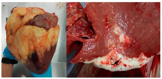Macroscopic image of the whole isolated heart from an extremely obese horse. (A) Hearts surrounded by pericardial fat. (B) Cross section of the heart wall with increased amount of pericardial fat, infiltrating the heart wall.