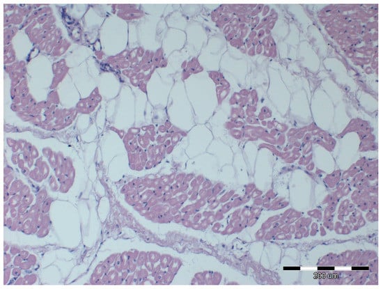 The hearts of obese horses were surrounded by a more pronounced amount of pericardial fat, in contrast to the lean group, where this amount of fat was negligible (Figure 1A). In some obese horses, macroscopic infiltration of adipose tissue into the heart muscle structure was observed (Figure 1B).