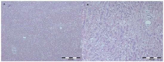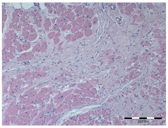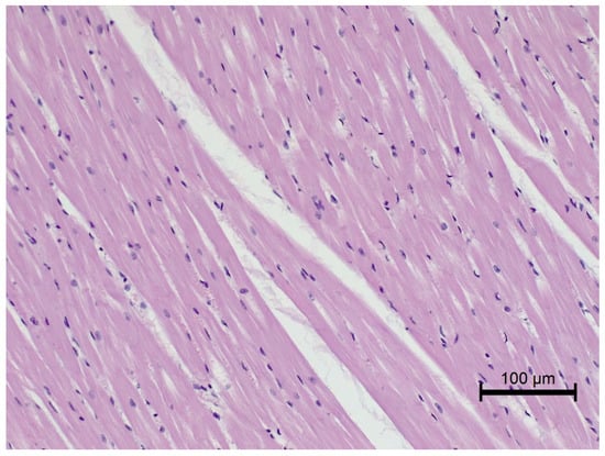 Microscopic image of the heart muscle specimen from a lean horse. Left ventricular wall—normal structure; HE staining; 200×.