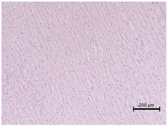 Microscopic image of the aorta specimen from a lean horse. Normal aortic wall; HE staining; 100×.