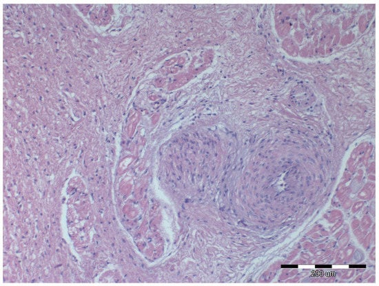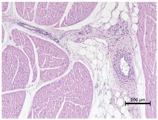 Microscopic image of the heart muscle specimen with coronary artery from a lean horse. Normal intraventricular coronary vessels; HE staining; 100×.