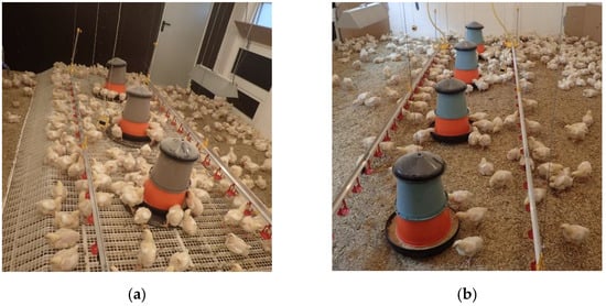 In one of the barns (experimental barn, Exp), about 50% of the floor space was equipped with an elevated perforated floor (5.3 m × 2.1 m), which was installed in the middle of the barn, under the water lines and feeding troughs at a height of 15 cm (see Figure 1a). The perforated floor was constructed out of plastic elements (Golden Broiler Floor, FIT Farm Innovation Team GmbH, Steinfurt, Germany), measuring 196 cm × 56 cm. The mesh size of the grid was 1.5 cm × 1.5 cm, and the slats were 0.5 cm thick. The residual floor space on the left and the right side of the perforated floor was littered. Adjusted elements connected the littered floor space and the elevated perforated floor to be used as ramps for accessing the floor. The angle between the barn floor and the ramps was about 30°. In the control barn (Con), the animals were kept under approximately commercial conditions on a littered concrete floor (see Figure 1b).