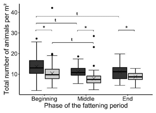 The total number of animals per m² in the observed area at the different phases of the fattening period (n = three trials each). Results are presented as boxplots (data range, median, and lower and upper quartile; outliers are included in the graph as dots and means as a cross). Results of the experimental group (Exp) are presented in dark gray; the control group (Con) results are presented in light gray. * Significant difference at p < 0.05, t tendency at p < 0.1.