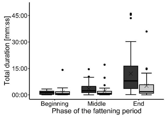 Total time completely observed focal animals (n = 80) spent in the observed area compared to runaways (n = 100) at the different phases of the fattening period. Results are presented as boxplots (data range, median, and lower and upper quartile; outliers are included in the graph as dots and means as a cross). Completely observed animals are presented in dark gray; runaways in light gray.
