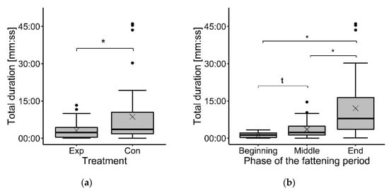 Total time focal animals spent in the observed area: (a) in the experimental group (Exp) and the control group (Con); (b) in the different phases of the fattening period. Results are presented as boxplots (data range, median, and lower and upper quartile; outliers are included in the graph as dots and means as a cross). * Significant difference at p < 0.05, t tendency at p < 0.1.