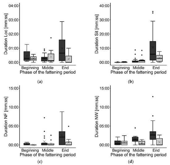 Duration of the different behaviors at the different phases of the fattening period: (a) locomotion (Loc); (b) sitting inactive (Sit); (c) located near the feeding trough (NF); and (d) located near the waterline (NW). Results are presented as boxplots (data range, median, and lower and upper quartile; outliers are included in the graph as dots and means as a cross). Results of the experimental group (Exp) are presented in dark gray; the control group (Con) results are presented in light gray.