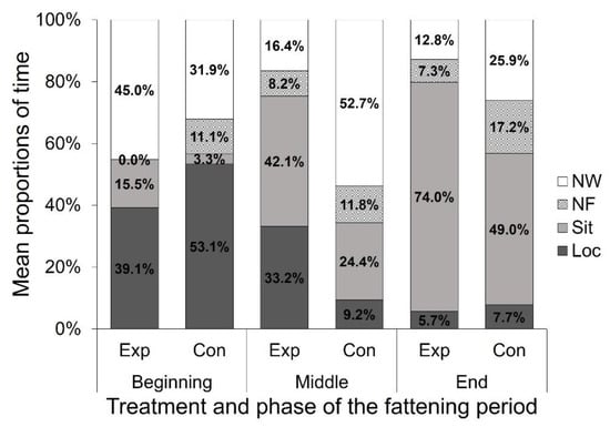 The mean proportions of the different behaviors of the total time spent in the observed area at the different phases of the fattening period in Exp and Con are shown in Figure 6. Generally, the proportion of the behavior Loc decreased over the fattening period, while the proportion of Sit increased in both treatment groups.