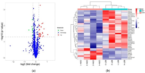 (a) Volcano plot of DAPs in breast muscle of broilers fed dietary betaine. Upregulated DAPs (fold change > 1.2 and p < 0.05) are shown in red while downregulated DAPs are shown in green (fold change < 0.83 and p < 0.05); blue dots represent proteins that are not significantly differentially expressed. (b) Hierarchical clustering analysis of the 35 DAPs in breast muscle of broilers detected in control (CON) and betaine (BET) groups.