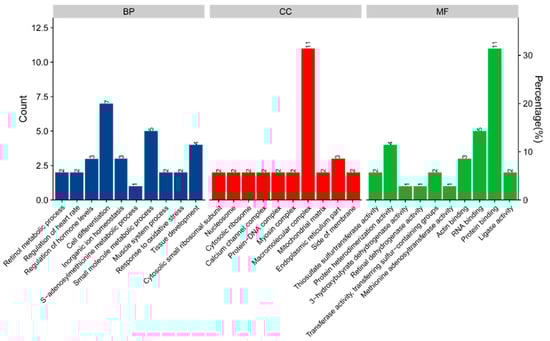 Enrichment of GO analysis of 35 DAPs in breast muscle of broilers fed betaine dietary. BP—biological process; CC—cellular component; MF—molecular function.