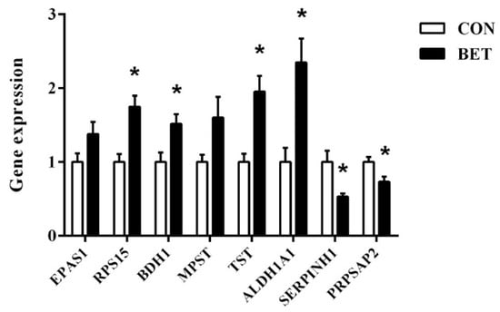 Verified the selected eight DAPs by real-time PCR. CON—control group; BET—betaine group; EPAS1—endothelial PAS domain protein 1; RPS15—ribosomal protein S15; BDH1—3-hydroxybutyrate dehydrogenase 1; MPST—mercaptopyruvate sulfurtransferase; TST—thiosulfate sulfurtransferase; ALDH1A1—aldehyde dehydrogenase 1 family member A1; SERPINH1—serpin family H member 1; PRPSAP2—phosphoribosyl-pyrophosphate-synthetase-associated protein 2. Results presented as means ± SEM (n = 8). * Bars marked with an asterisk were significantly different at p < 0.05.