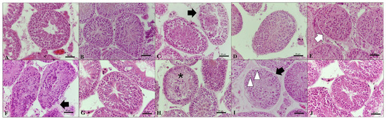 Representative micrographs used for histomorphological evaluations of testicular tissue sections from adult red-rumped agoutis (n = 5 males) after different cryopreservation treatments. (A) Non-cryopreserved control group, and cryopreserved groups using (B) slow freezing [SF] with dimethyl sulfoxide [DMSO], (C) SF with ethylene glycol [EG], (D) SF with DMSO + EG, (E) solid-surface vitrification [SSV] with DMSO, (F) SSV with EG, (G) SSV with EG + DMSO, (H) conventional vitrification [CV] with DMSO, (I) CV with EG, (J) CV with DMSO + EG. Black arrows indicate rupture from the basal membrane. White arrow shows shrinkage from the basal membrane. Asterisks shows tubular cell loss. White arrowheads show cell swelling. Scale bar: 20 µm.