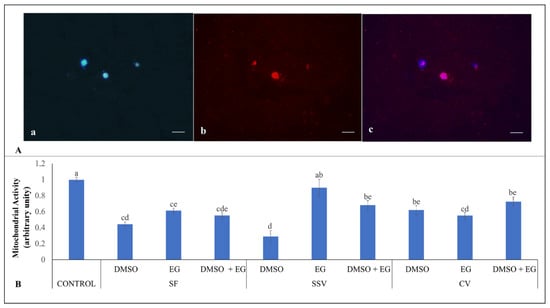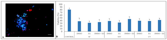 Mitochondrial activity was similar in the EG/SSV group (0.90 ± 0.11%) and in the control group (1.00 ± 0.03%; p > 0.05; Figure 3). Overall, a reduction in mitochondrial activity was observed for all the other treatments in comparison with the control group (p < 0.05; Figure 3), with the lowest values observed in the DMSO/SSV group (0.29 ± 0.08%). Intermediate values of mitochondrial activity were observed with EG/SF, DMSO + EG/SSV, DMSO/CV, and DMSO + EG/CV (p > 0.05; Figure 3).