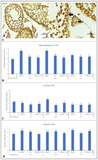 Average values of NORs (Figure 4A) were 2.92 ± 0.08 for spermatogonia (Figure 4B), 2.36 ± 0.07 for Leydig cells (Figure 4C), and 3.73 ± 0.11 NORs for Sertoli cells (Figure 4D). Preservations of spermatogonia proliferative potential in DMSO + EG/SF and DMSO + EG/SSV groups were comparable to control groups (p > 0.05; Figure 4B), whereas values increased (p < 0.05) in all the other treatment groups. Preservations of Leydig cell proliferative potential in DMSO/SF and DMSO + EG/SSV groups were similar to control groups (p > 0.05; Figure 4C). Reductions (p < 0.05) in the NOR values were observed for the other groups, except for DMSO/SSV group, which exhibited a significant increase (p < 0.05) in the number of NORs in comparison to the control group (Figure 4C). Preservations of Sertoli cell proliferative potentials in DMSO + EG/SF, DMSO + EG/SSV and EG/CV groups were similar to the control groups (p > 0.05; Figure 4D), whereas value increases in the proliferative potential were found in all the other treatment groups (p < 0.05; Figure 4D).