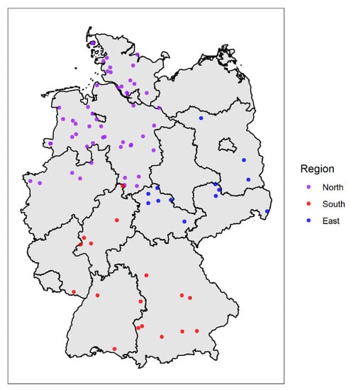 Geographical location of the 83 sheep flocks in Germany from which samples were used to determine the serogroups. Purple: Northern Germany, blue: Eastern Germany and red: Southern Germany.