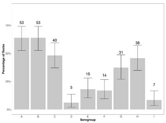 The most prevalent serogroups on the flock level were serogroups A and B, as each detected in 53 flocks (63.86%). The least prevalent were serogroups D and I, detected in five (6.02%) and seven flocks (8.43%), respectively (Figure 2).